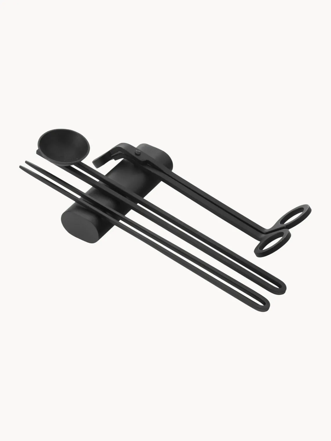 El set diseñado para el cuidado y rendimiento óptimo de velas se compone de cuatro piezas e incluye elegantes herramientas hechas de metal con recubrimiento en polvo. Un apagavelas, un cortador de mecha y un recogedor garantizan menos humo y hollín, una mejor combustión y una extinción limpia de las llamas, mientras que la bandeja adjunta almacena los artículos cuando no están en uso.