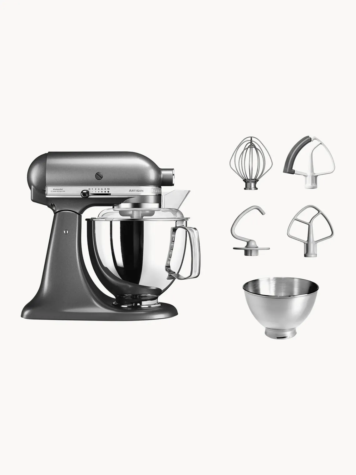 Elige entre una gama de colores, desde tonos neutros a un elegante plateado, para que combine con tu interior. El robot de cocina viene con un bol de acero inoxidable de 4,8 litros que puede procesar hasta 1 kg de harina, 1 litro de nata montada, 1,5 kg de puré de patatas o masa para 108 galletas. Este modelo se suministra con accesorios adicionales. Además de los accesorios estándar -batidor de varillas, batidor plano y gancho amasador- también dispone de un bol de acero inoxidable con una capacidad de 3 litros, un protector contra salpicaduras y un batidor flexible con un práctico efecto espátula, ideal para tartas, glaseado o puré de patatas.