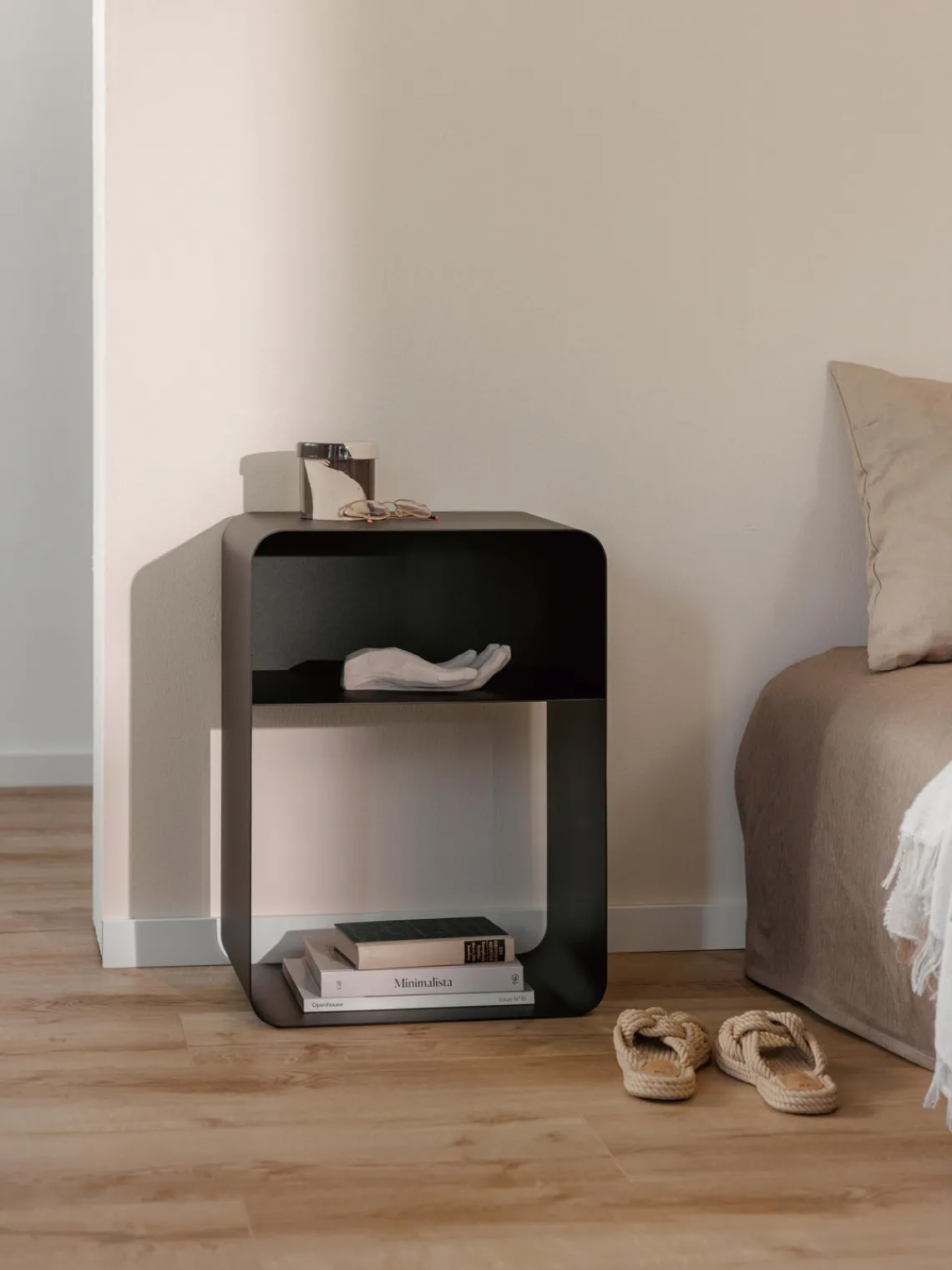 La mesita de noche tiene un compartimento.