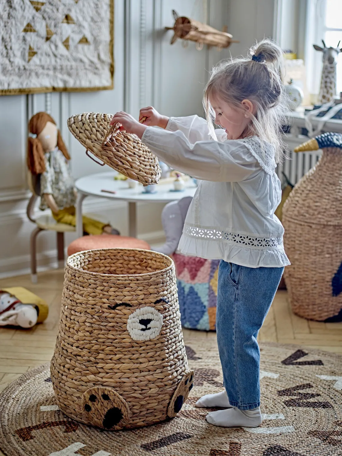 La cesta de almacenaje TIMONE con tapa de Bloomingville MINI es ideal para guardar cosas y a la vez un divertido compañero de juegos. La gran cesta con forma de oso permite guardar todos los juguetes y añade un toque acogedor a cualquier habitación. La tapa de la cesta se puede quitar para que las manitas puedan alcanzar fácilmente los ositos y juguetes y guardarlos de nuevo. El aspecto de la cesta puede variar en función de la temporada en que se coseche el material.