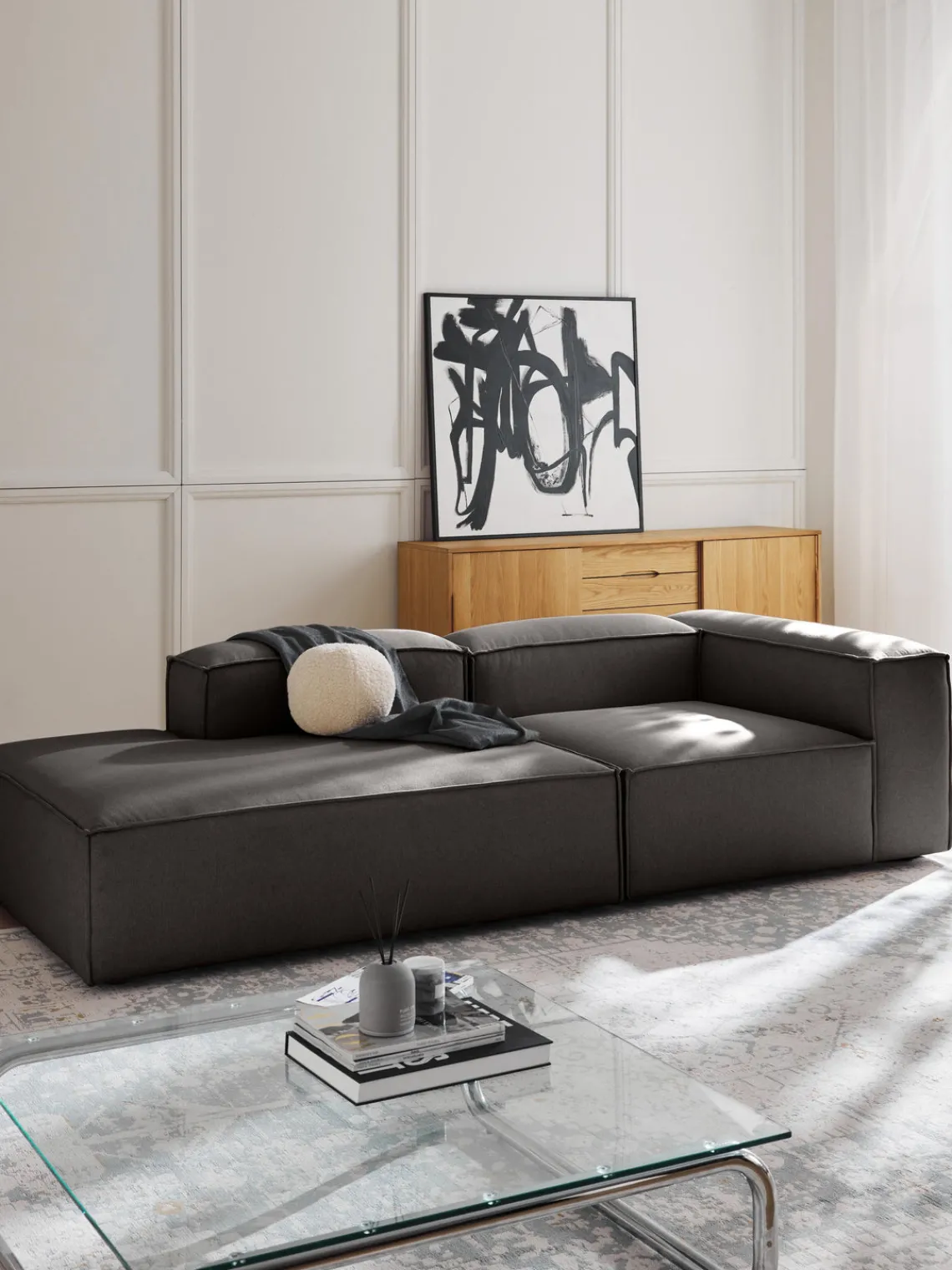 También puedes descubrir otros productos a juego en nuestra gama que se adaptan perfectamente a LENNON: la consola LANA no solo ofrece espacio de almacenamiento adicional, sino que también es un elemento decorativo que se adapta exactamente a las dimensiones de LENNON. El taburete LENNON con bandeja de madera se puede utilizar de forma flexible como mesa de centro o como elemento intermedio en el sofá, para conseguir un aspecto elegante y espacio de almacenamiento práctico. No te olvides del complemento perfecto: cojines de sofá en todos los tejidos y colores de LENNON para un look perfecto, ya sea uniforme o en un estilo mix & match.