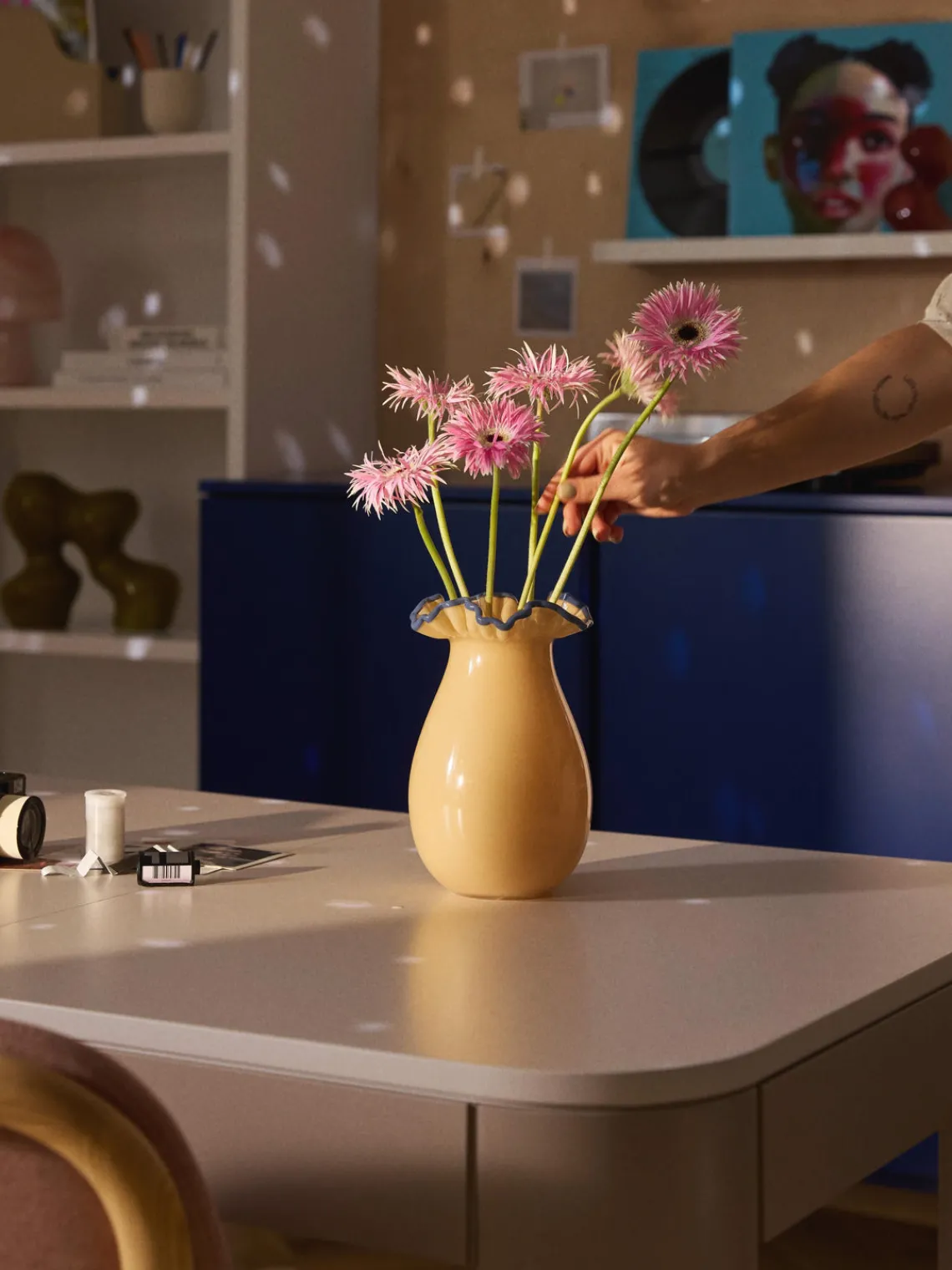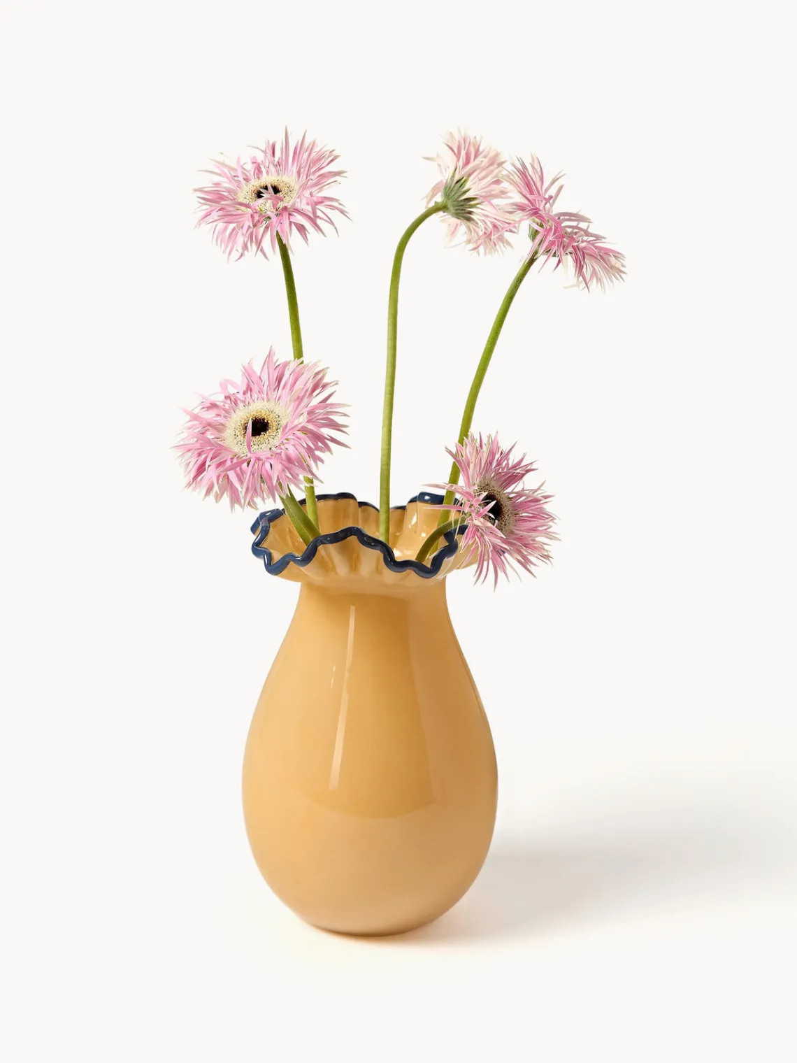 GLORIA es la incorporación más linda a nuestra colección decorativa. Con su encantadora forma de pera y sus divertidos volantes en el borde, aporta un toque fresco a tu hogar. Al mismo tiempo, su diseño que mejora el estado de ánimo pone acentos coloridos, mientras que el borde orgánico ondulado en azul contrastante aporta un toque moderno.