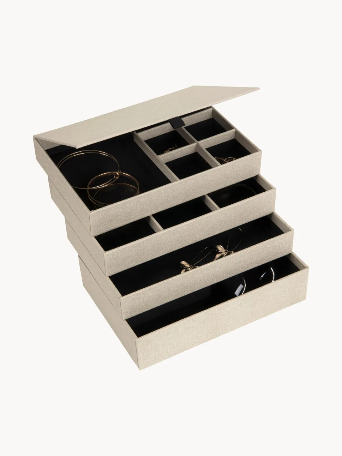 Caja lujosa con mucho espacio para tus joyas y otros objetos valiosos. La tapa de fácil apertura con cierre magnético protege el contenido del polvo y los arañazos. Los compartimentos separados se pueden utilizar para apilar y organizar cuidadosamente gemelos, collares, pulseras, aretes, broches, gafas de sol y todas las demás joyas.