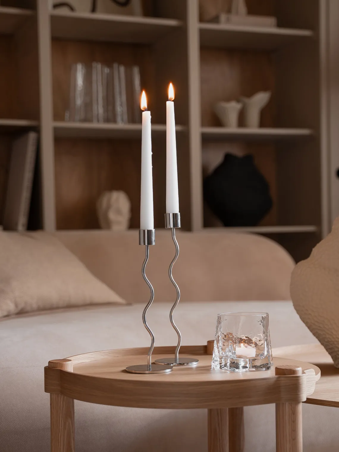 El candelabro toma la luz de la mecha encendida en su interior y la convierte en un hermoso patrón proyectado sobre la superficie en la que se encuentra. La inspiración para la forma proviene del tronco de los árboles. Desde el suelo, puedes ver el comienzo de las raíces antes de que se vuelvan más redondeadas más arriba. Gry, que significa amanecer en danés, tiene diferentes asociaciones de palabras, ya que también es un juego de la palabra gro, que significa crecer. – Diseñado por Tim Torp Hansen, Five Seven
