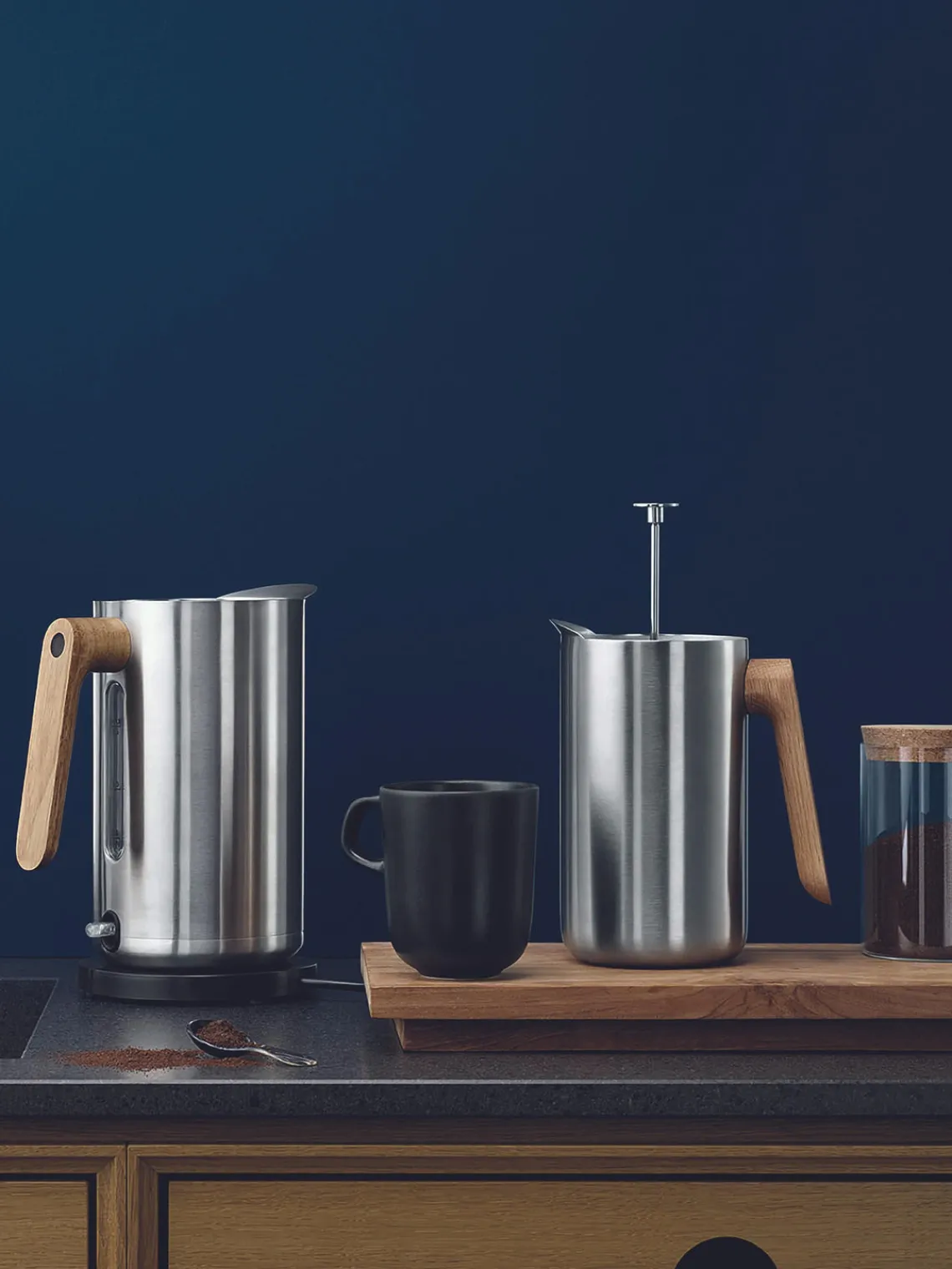 Con un dispositivo de filtro de prensa, gracias al cual se puede preparar café fresco en poco tiempo y sin mucho esfuerzo.