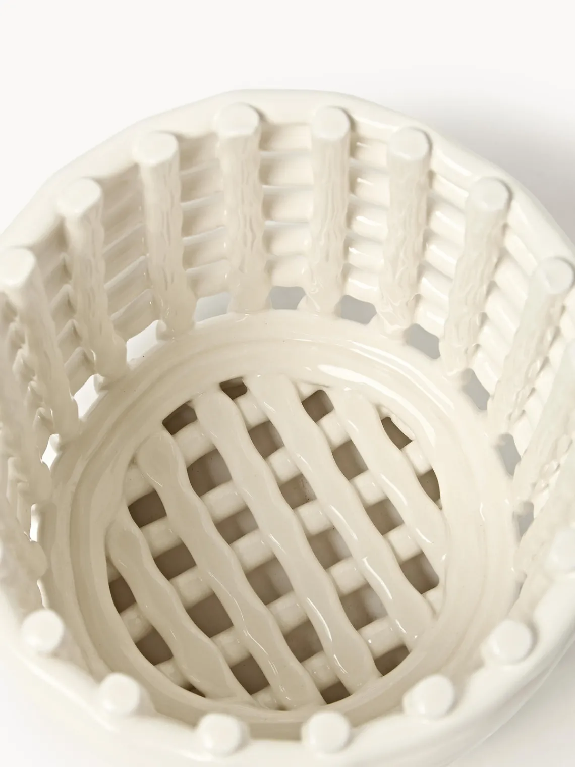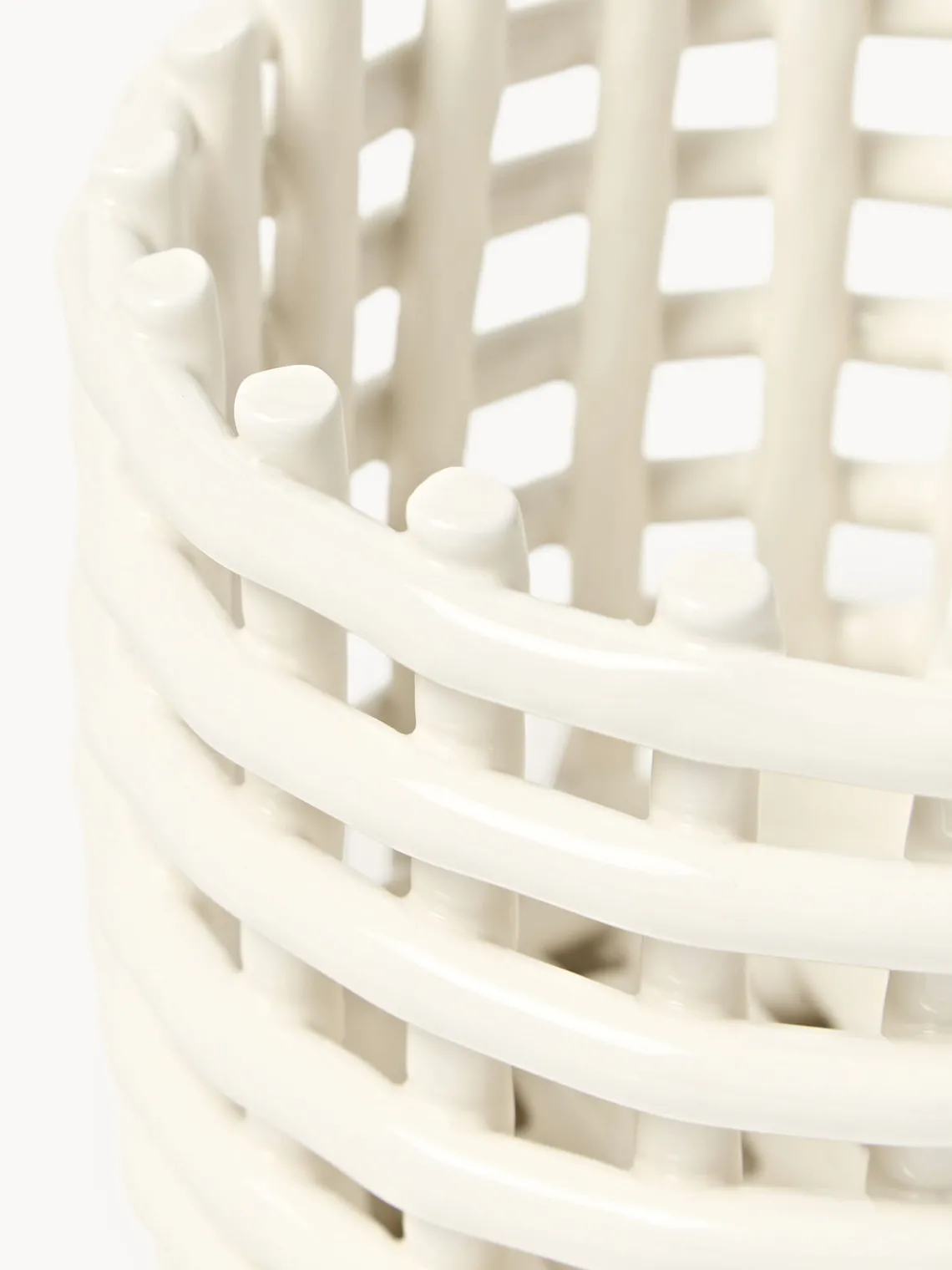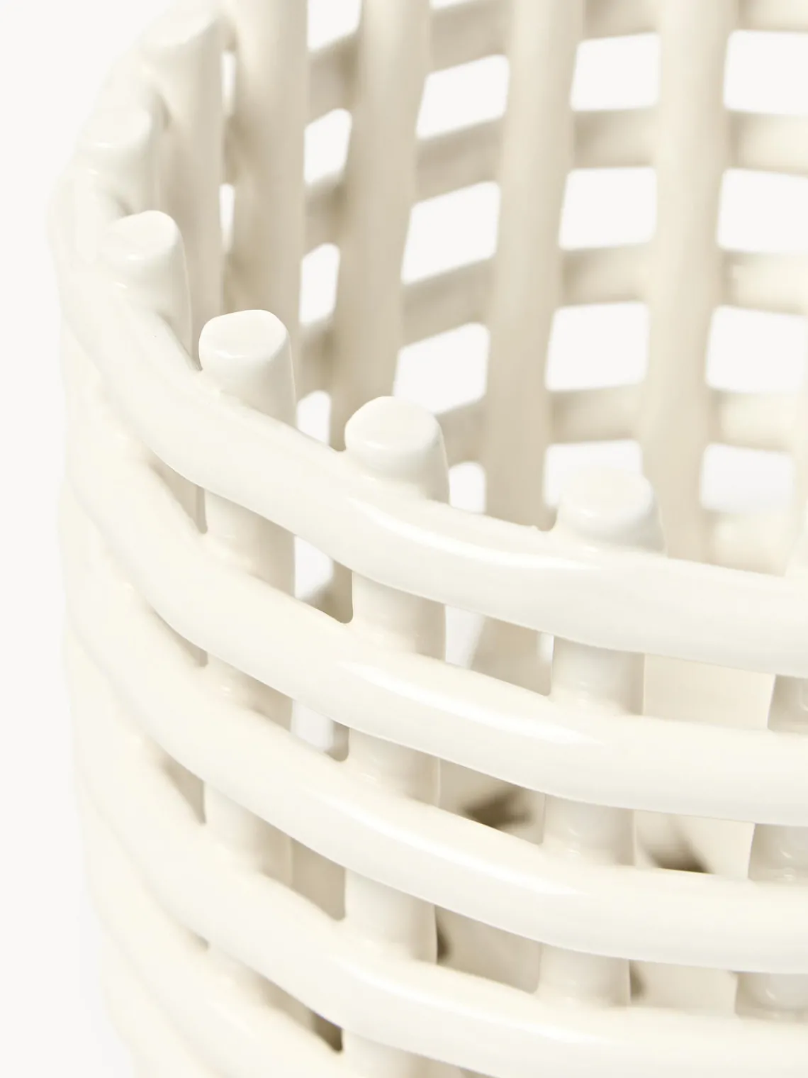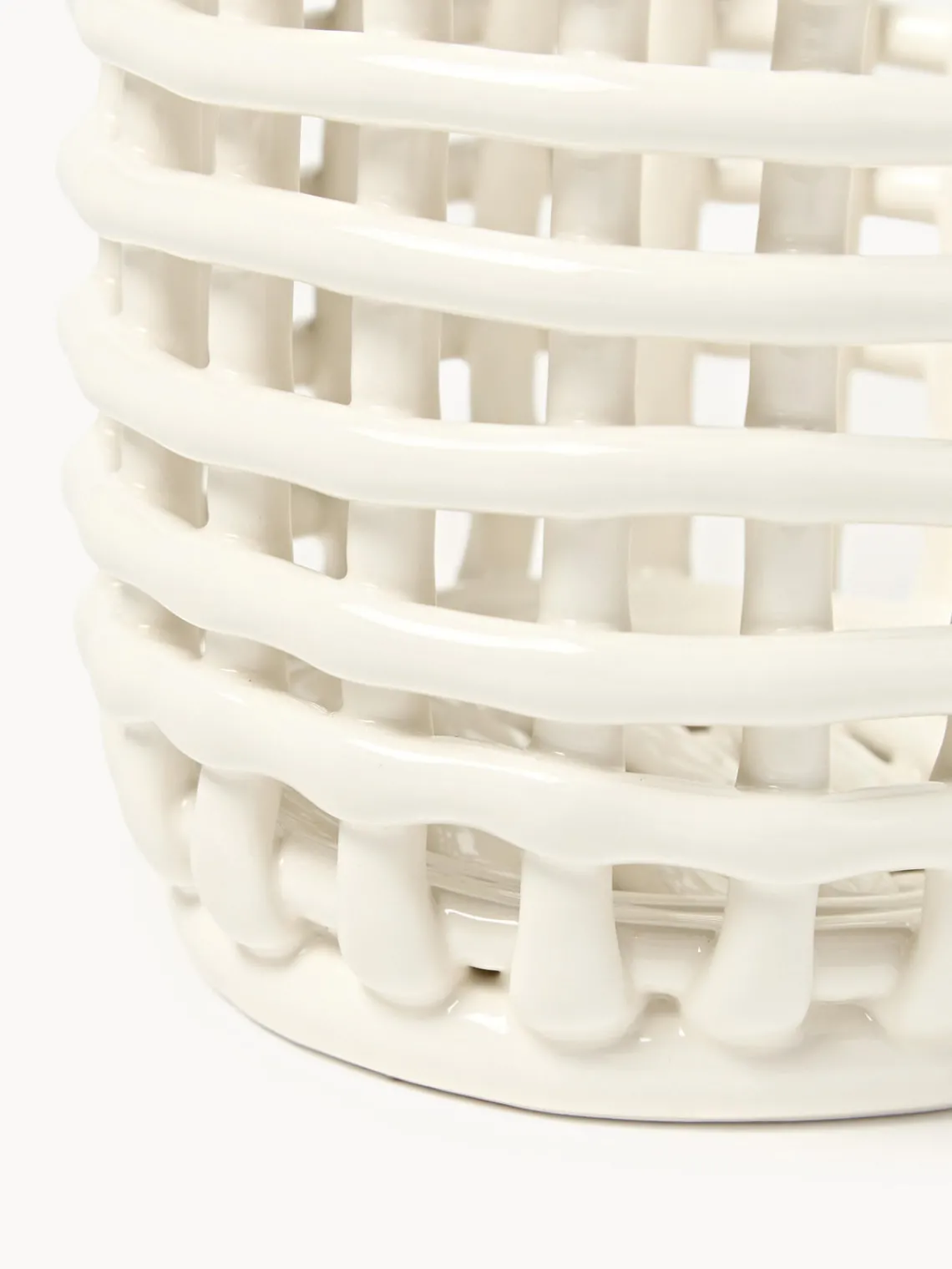 La cesta de almacenaje hecha a mano Nalan evoca la sensación familiar de los recipientes tejidos y traslada la cestería tradicional a la cerámica. Su diseño multifuncional puede utilizarse como macetero, frutero o centro decorativo de una habitación. Moldeada a mano y artísticamente irregular, cada cesta es única.
