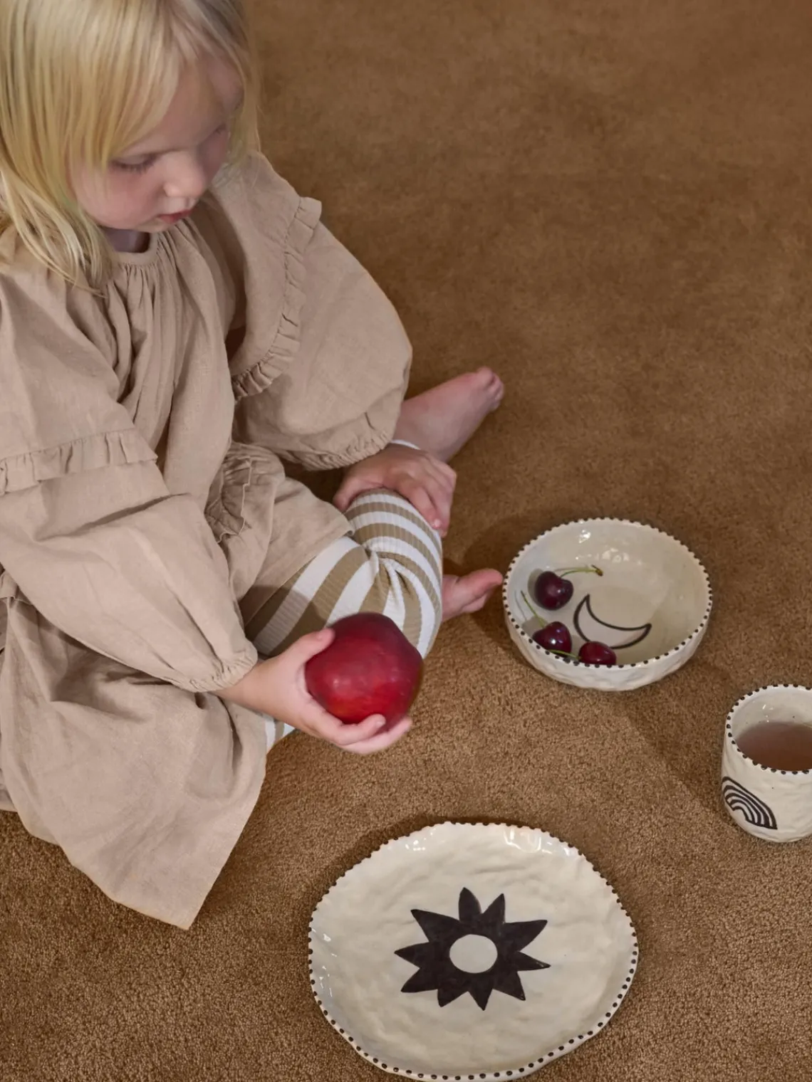 Este set de vajilla infantil de 3 piezas pintado a mano se compone de un plato, un bol y una taza.