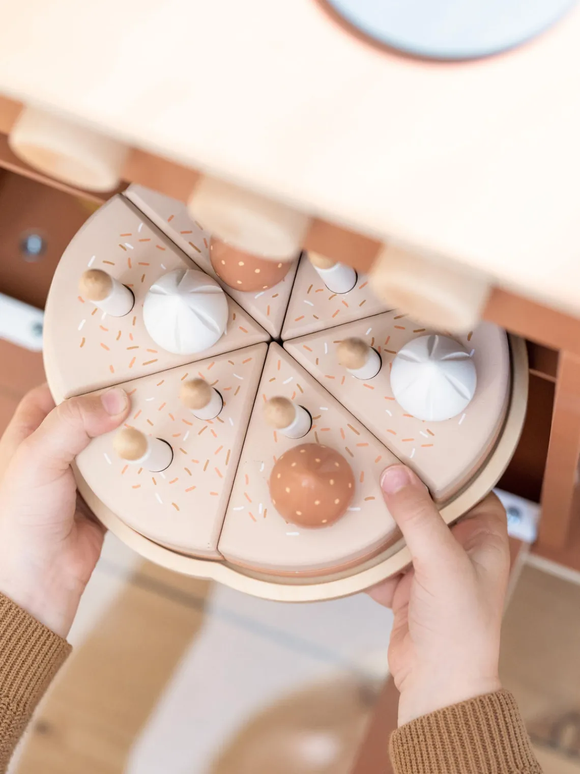 Con esta tarta de cumpleaños de madera, tu hijo podrá sumergirse en varios juegos de rol. Un día, podrán meterse en el papel de pastelero y perfeccionar el agarre de las pinzas. Al día siguiente, celebrarán una festiva fiesta de cumpleaños y practicarán tradiciones como cantar canciones de cumpleaños, aplaudir e intercambiar regalos.
