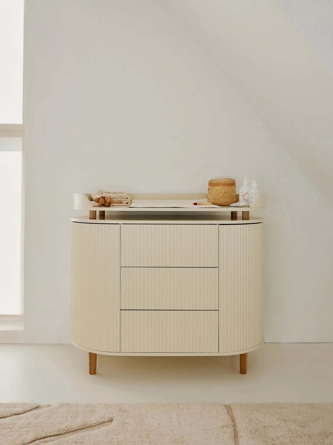Cuando el cambiador ya no sea necesario, simplemente se puede quitar la mesa y utilizar la cómoda en la habitación de los niños o en otras habitaciones de la casa, para poder disfrutar de ella durante muchos años. Las patas de forma cónica y los tornillos invisibles caracterizan el diseño característico de KAS Copenhagen. La colección KAI está inspirada en las columnas dóricas, un elemento arquitectónico de la antigua Grecia que representa uno de los cinco órdenes de la arquitectura clásica.