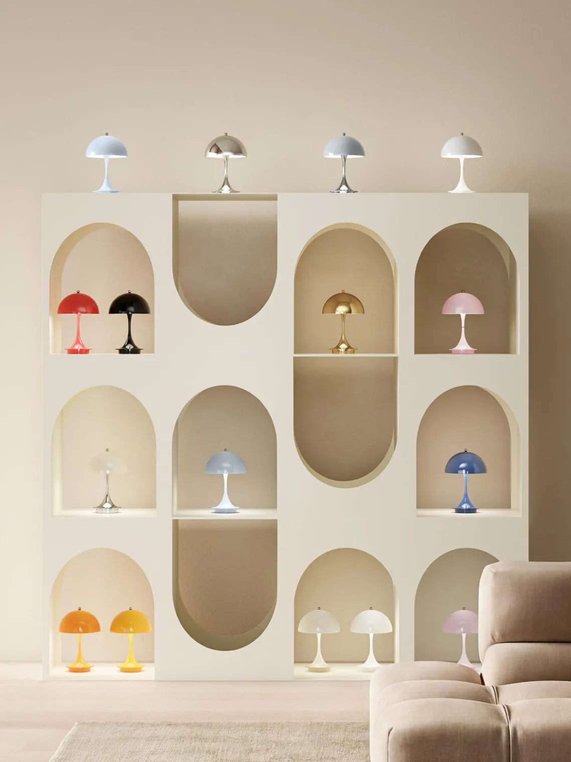 La PANTHELLA fue diseñada en 1971 por Verner Panton en colaboración con Louis Poulsen. Su inusual diseño no sólo refleja el estilo lúdico de Panton, sino que también proporciona una luz única y agradable gracias a sus formas orgánicas. La pantalla semiesférica emite la mayor parte de la luz hacia abajo, donde se refleja en la base en forma de trompeta y baña el entorno con una luz suave y difusa.