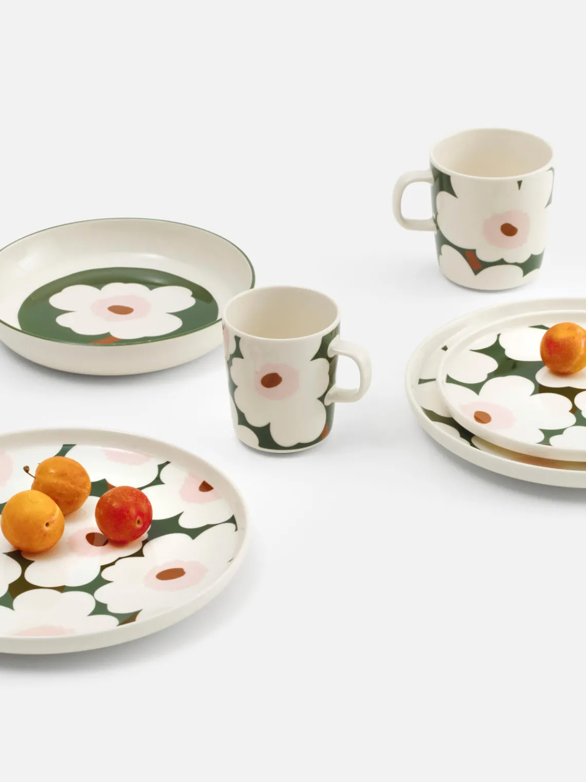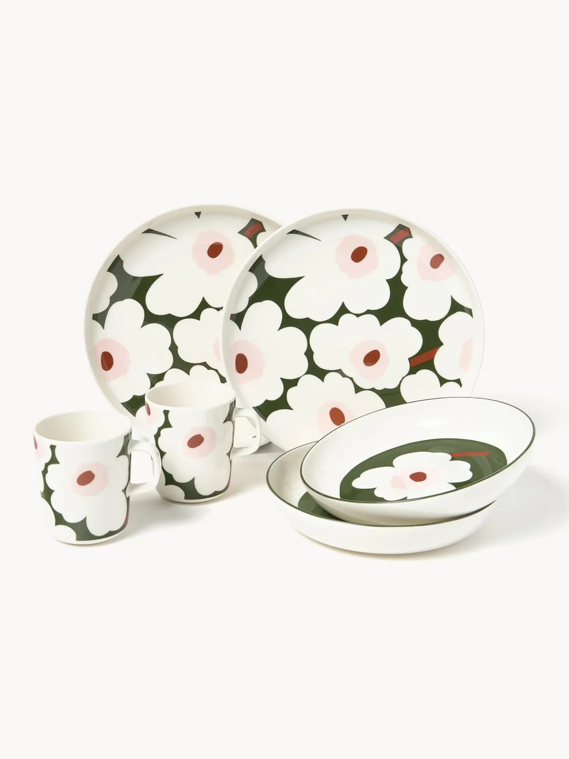 Esta vajilla de 6 piezas con motivos florales consta de dos platos llanos, dos platos postre y dos tazas.