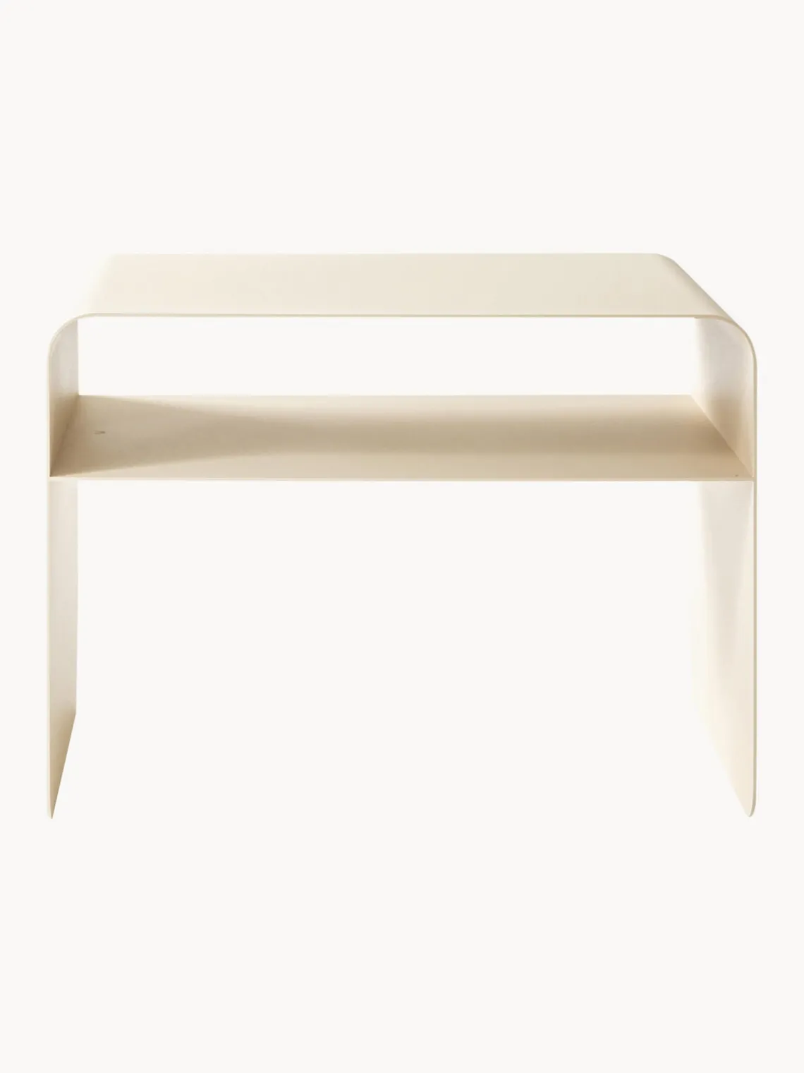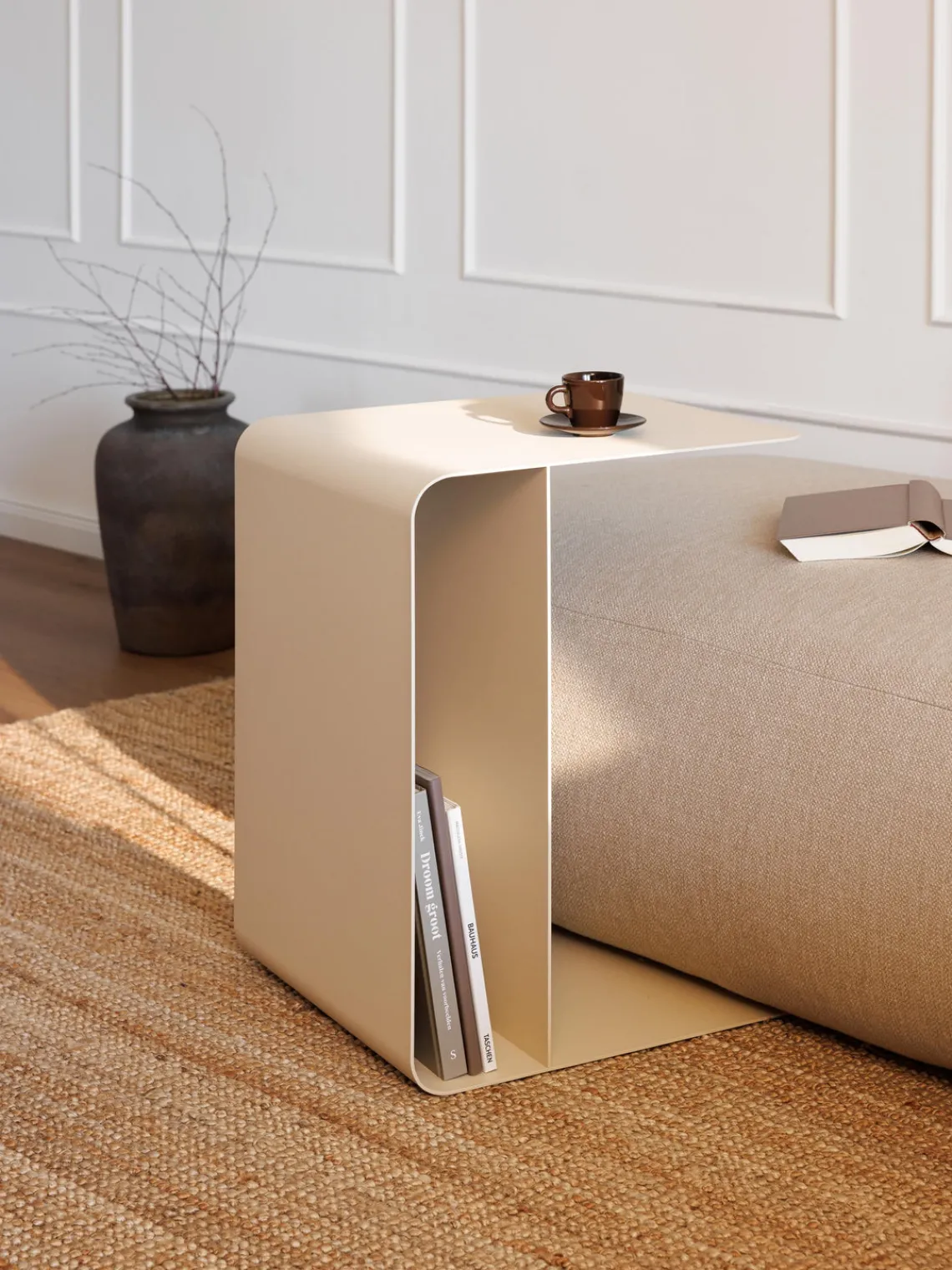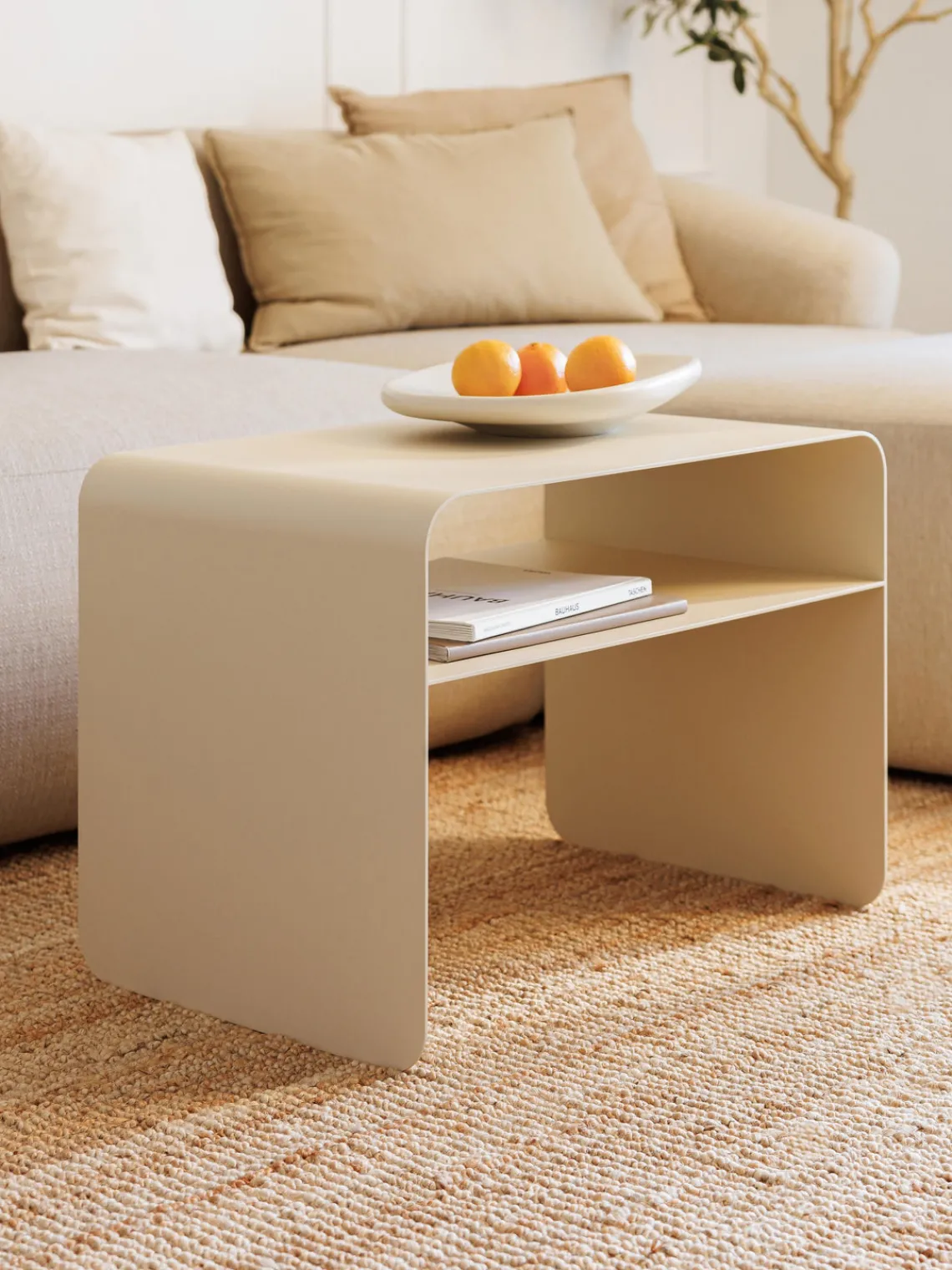 Mesa auxiliar de metal con revistero.