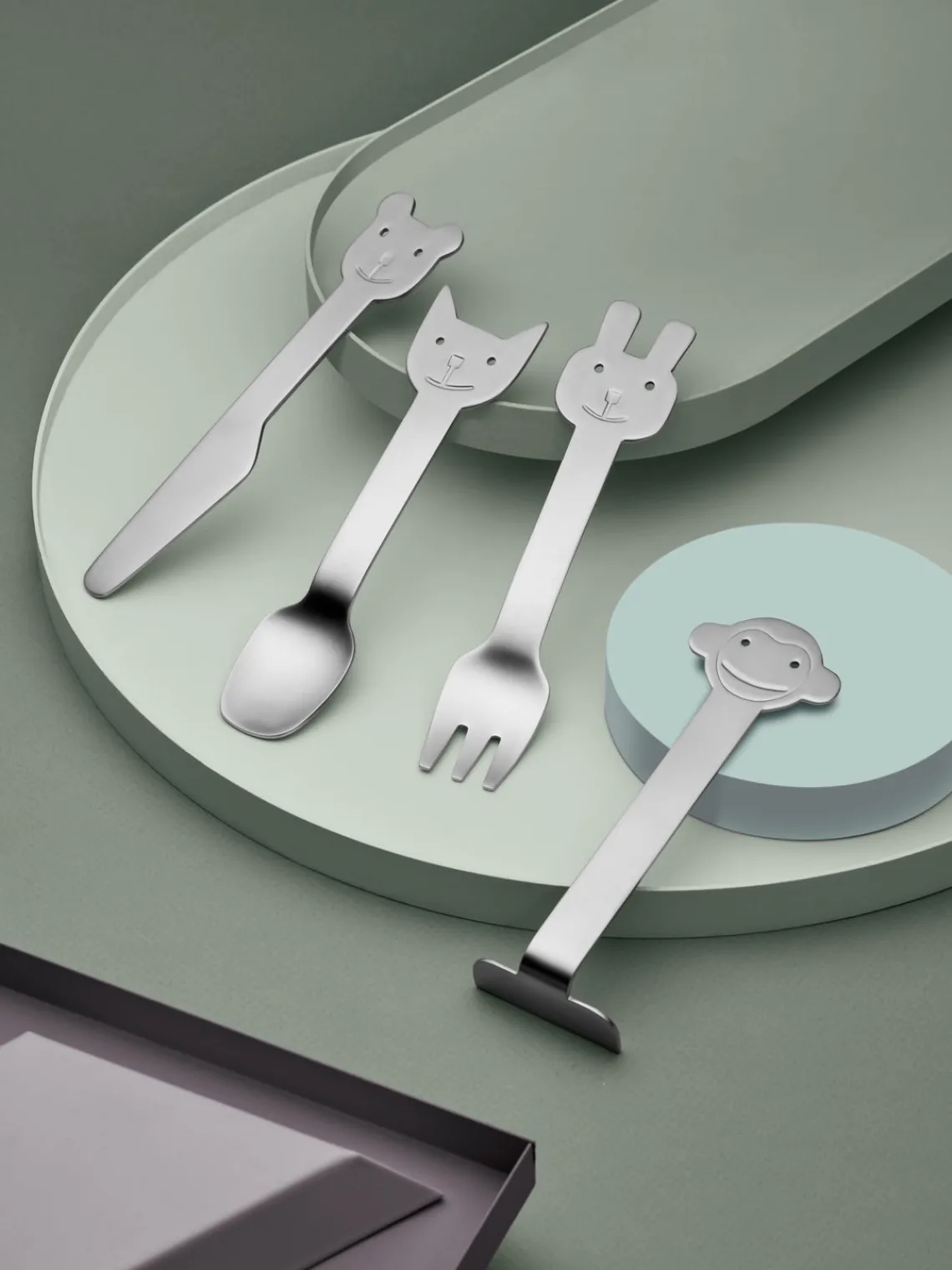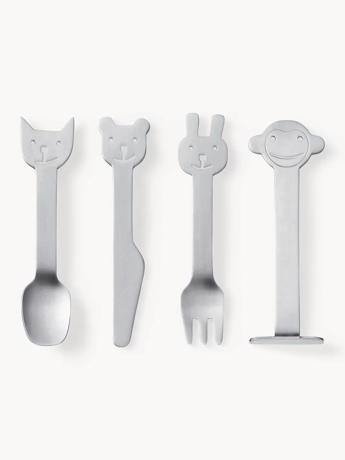 Esta cubertería infantil de 4 piezas con superficie cepillada mate consta de un tenedor, un cuchillo, una cuchara y un pisón para niños.