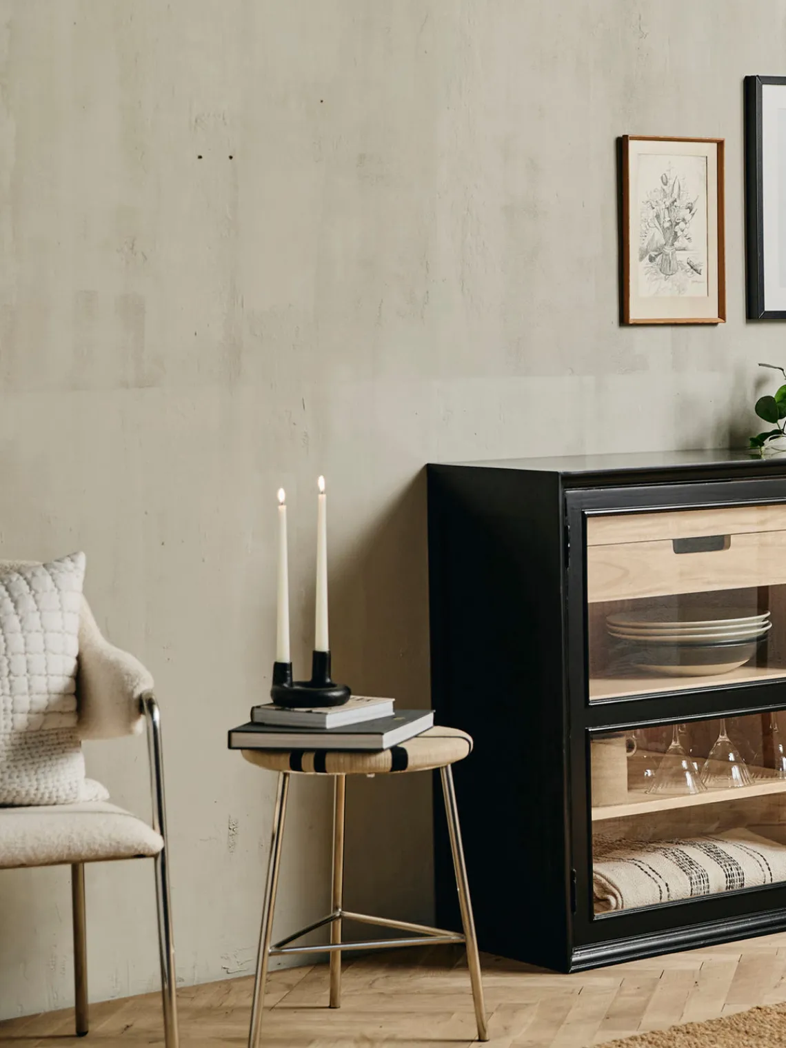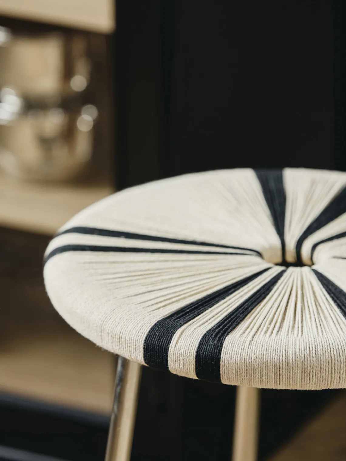 Taburete MORICE con estructura cromada y asiento a rayas. #Un taburete en perfecto equilibrio entre diseño crudo, elegante y moderno. El taburete MORICE cuenta con un asiento bellamente tejido a mano en tonos naturales, donde el patrón distintivo crea un aspecto dinámico y llamativo. #La combinación de la superficie brillante y el asiento geométrico proporciona una expresión ligera, mientras que