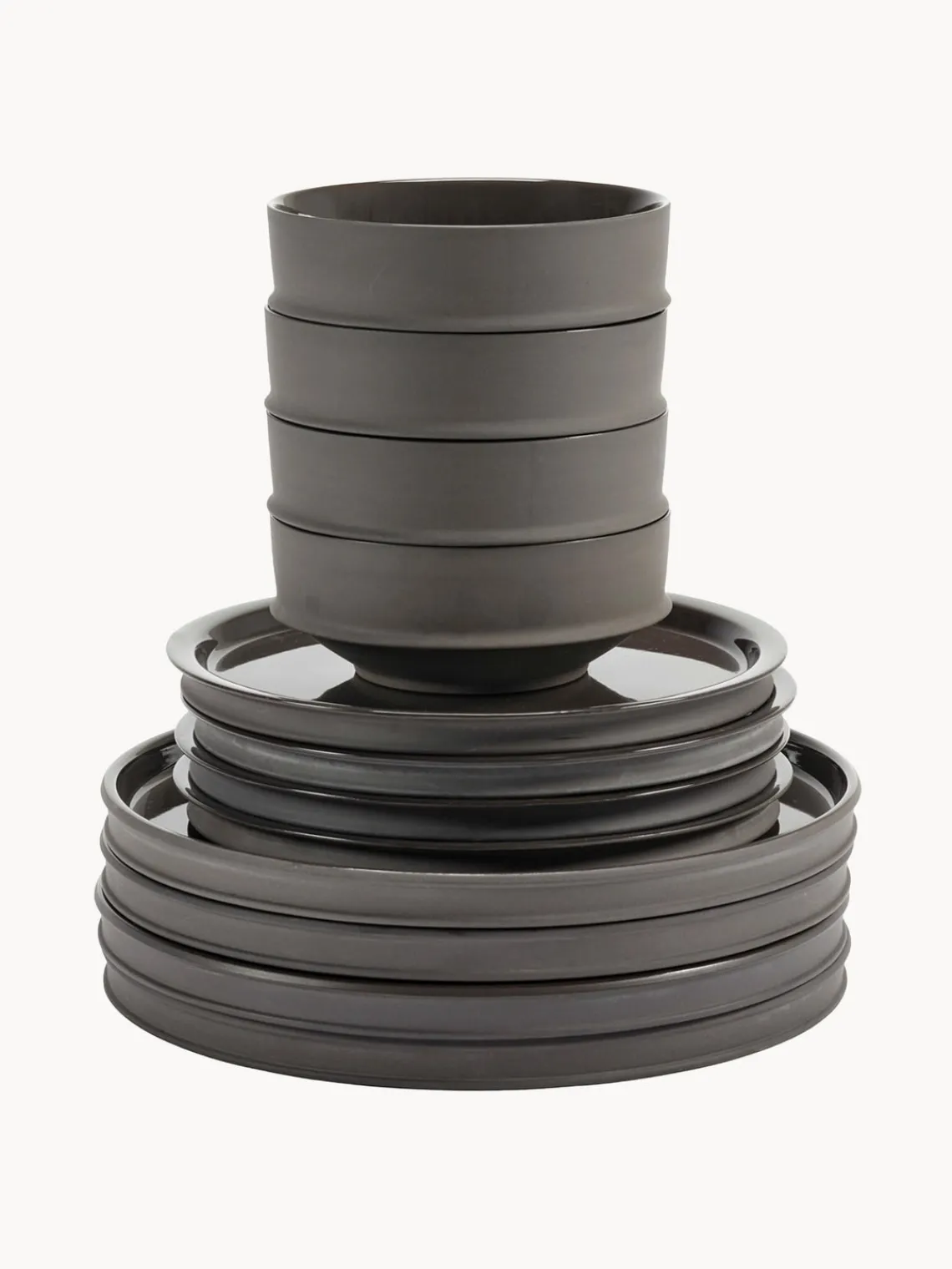Esta vajilla de 12 piezas con esmalte reactivo consta de cuatro platos llanos, cuatro platos postre y cuatro cuencos.
