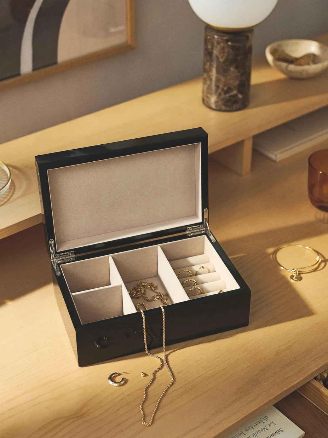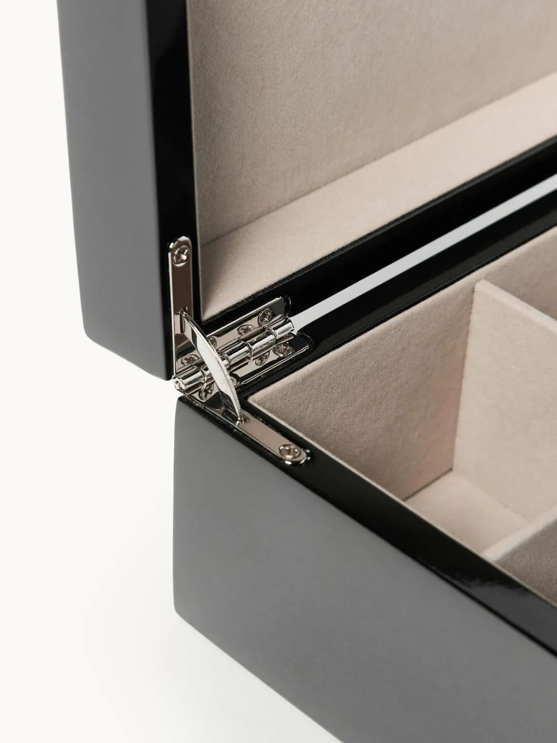El joyero con inserto extraíble consta de tres compartimentos y un compartimento para anillos. El acabado brillante multicapa hace que la caja sea la favorita de los usuarios de joyas debido a su diseño elegante y atemporal.