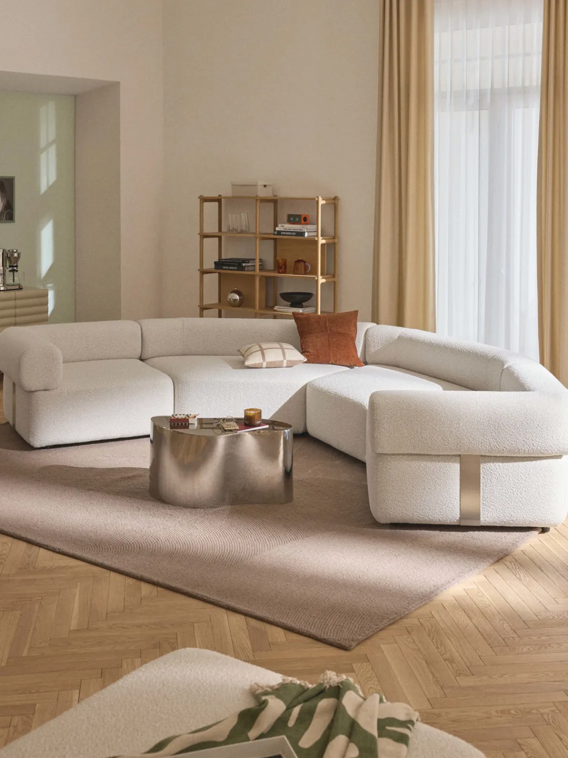 Los cuatro módulos pueden combinarse de diversas formas. El sofá se entrega en cuatro partes que pueden conectarse individualmente mediante cierres situados en la parte inferior de los módulos.