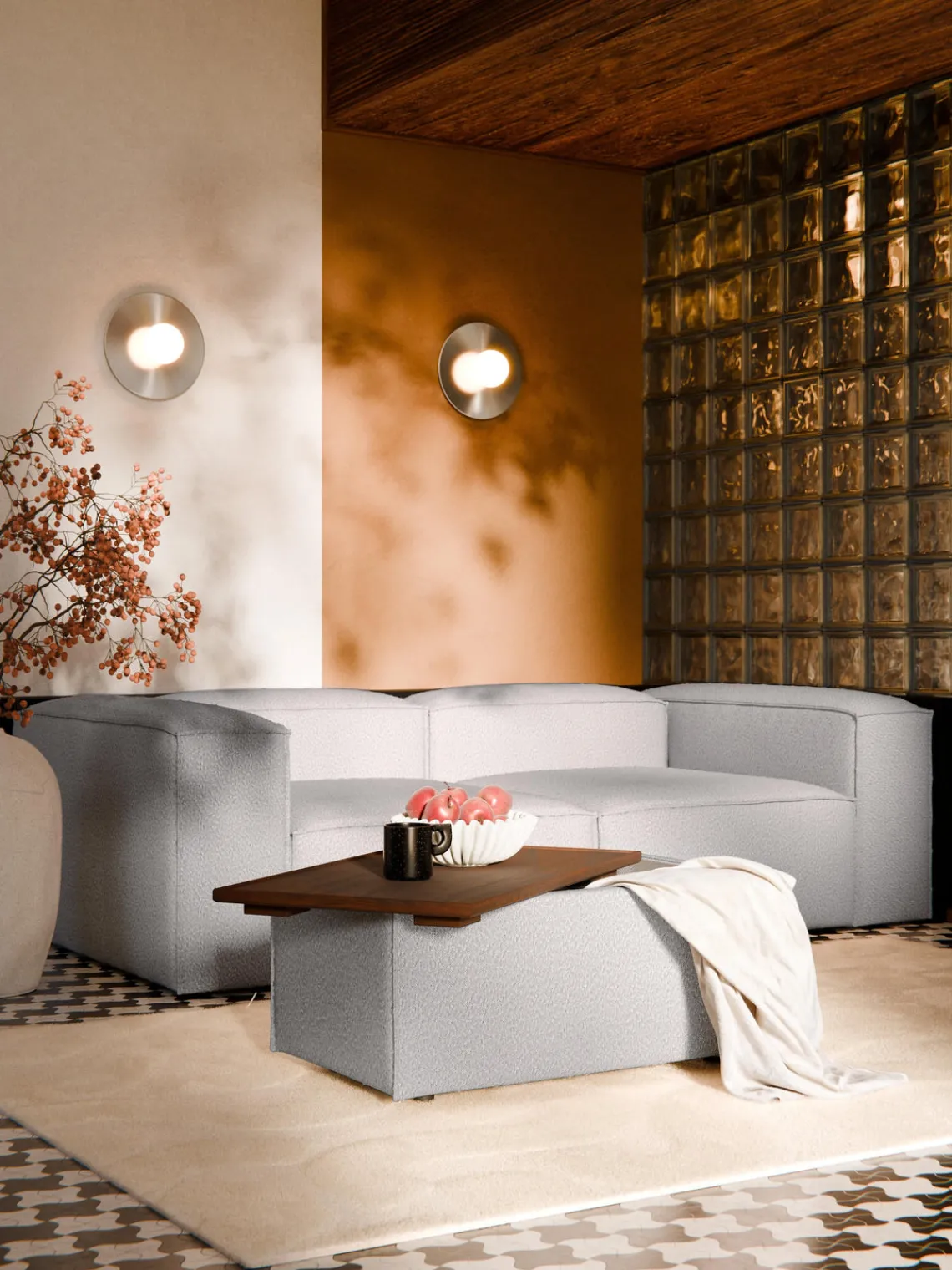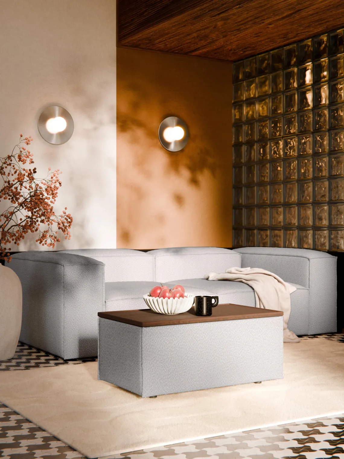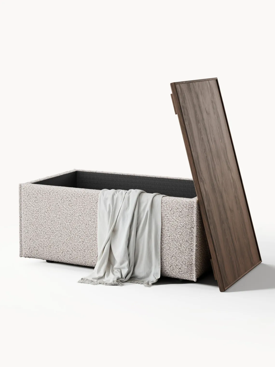 – Tapizado en tejido bouclé muy duradero y de fácil cuidado, disponible en colores diferentes