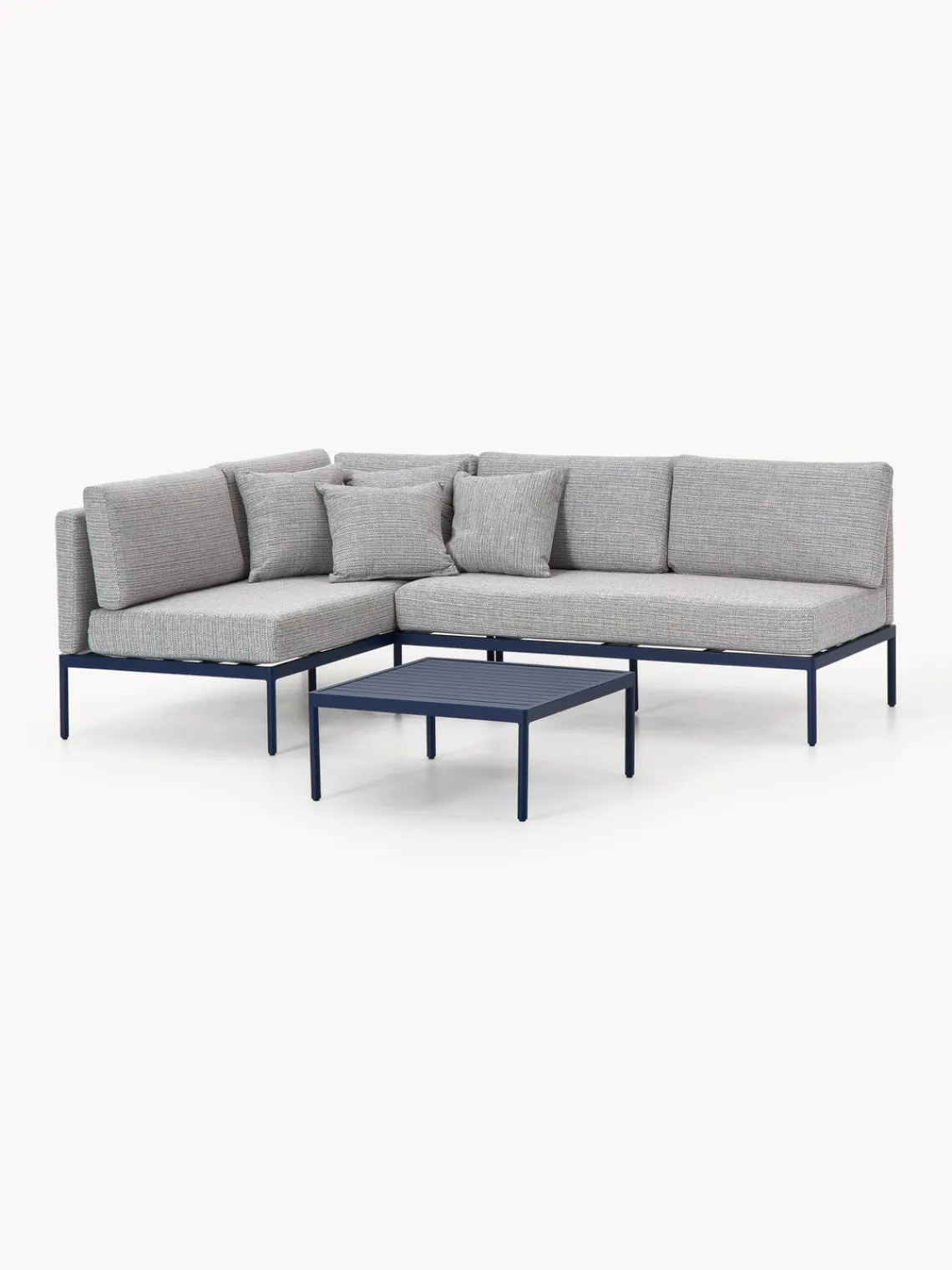 Set lounge para exterior de 3 piezas que consta de un sofá rinconero y una mesa de centro, se entrega con cojines de asiento y respaldo.
