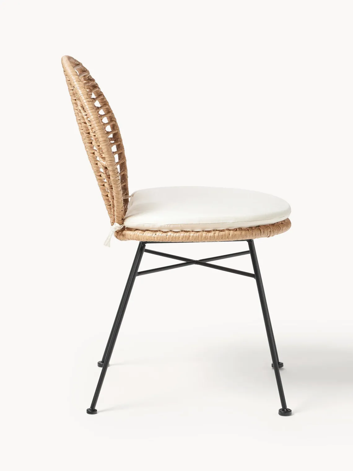 Podrás elegir entre varios colores: ratán de las sillas en un cálido color marrón claro con armazón en negro mate, que aporta un moderno contraste, o bien puedes optar por la versión totalmente negra, para un look sofisticado. Los cojines que vienen incluidos proporcionan un confort adicional y hacen que sentarse sea aún más agradable.
