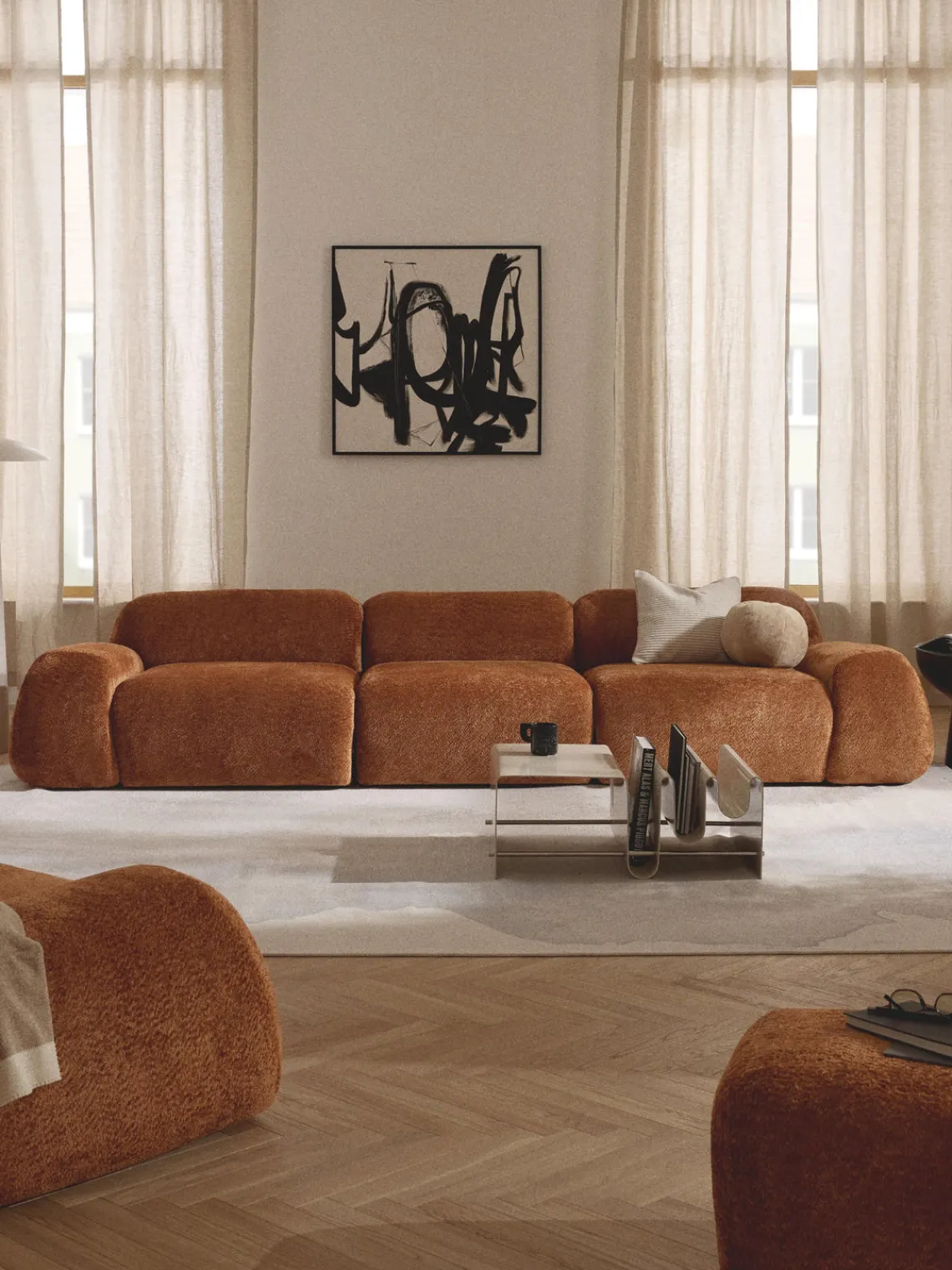 El sofá se entrega en tres partes que pueden montarse individualmente mediante cierres situados en la parte inferior de los módulos.