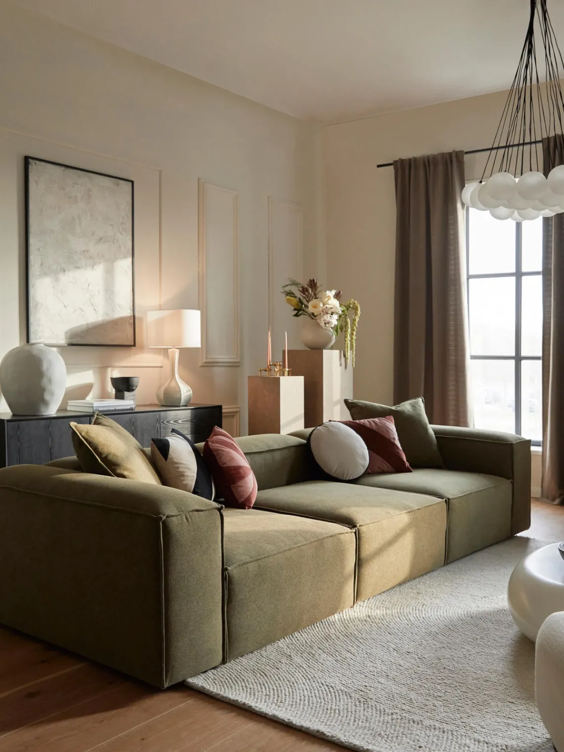 También puedes descubrir otros productos a juego en nuestra gama que se adaptan perfectamente a LENNON: la consola LANA no solo ofrece espacio de almacenamiento adicional, sino que también es un elemento decorativo que se adapta exactamente a las dimensiones de LENNON. El taburete LENNON con bandeja de madera se puede utilizar de forma flexible como mesa de centro o como elemento intermedio en el sofá, para conseguir un aspecto elegante y espacio de almacenamiento práctico. No te olvides del complemento perfecto: cojines de sofá en todos los tejidos y colores de LENNON para un look perfecto, ya sea uniforme o en un estilo mix & match.