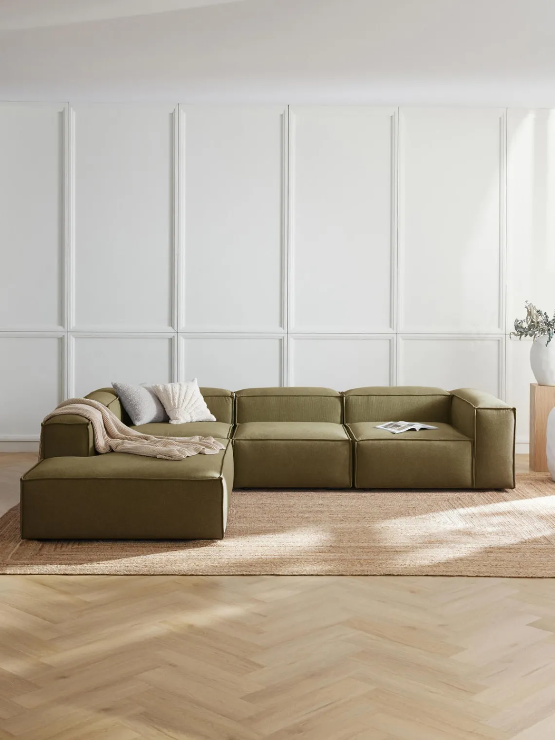 Los cuatro módulos se pueden combinar a tu gusto para crear tu sofá. Se entrega en cuatro partes, que se pueden juntar individualmente mediante enganches en la parte inferior de los módulos.