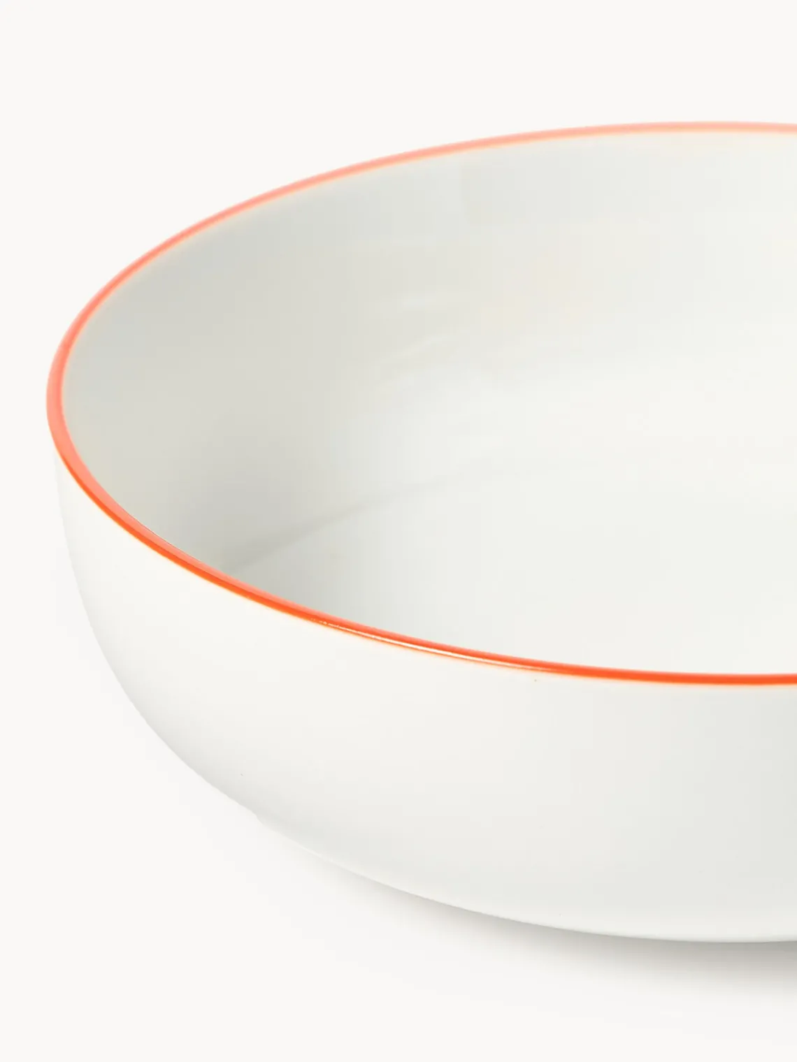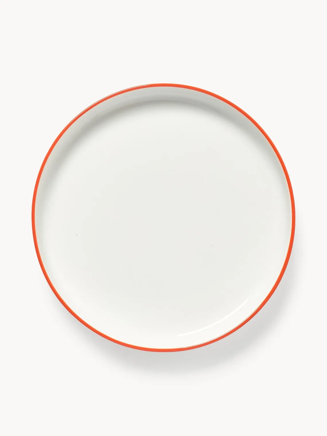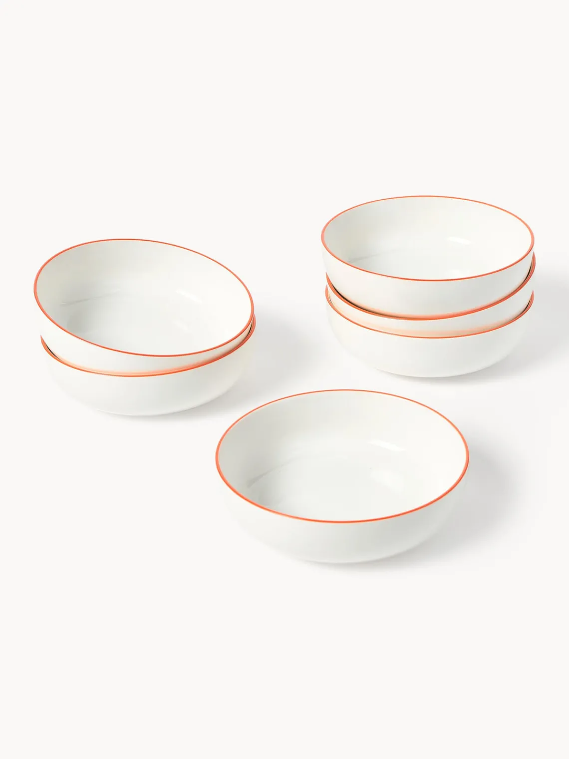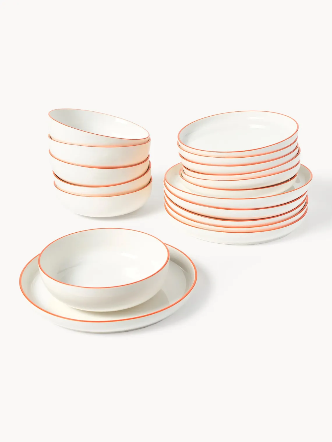 Esta vajilla de 18 piezas con borde naranja se compone de seis platos llanos, seis platos hondos y seis platos postre.