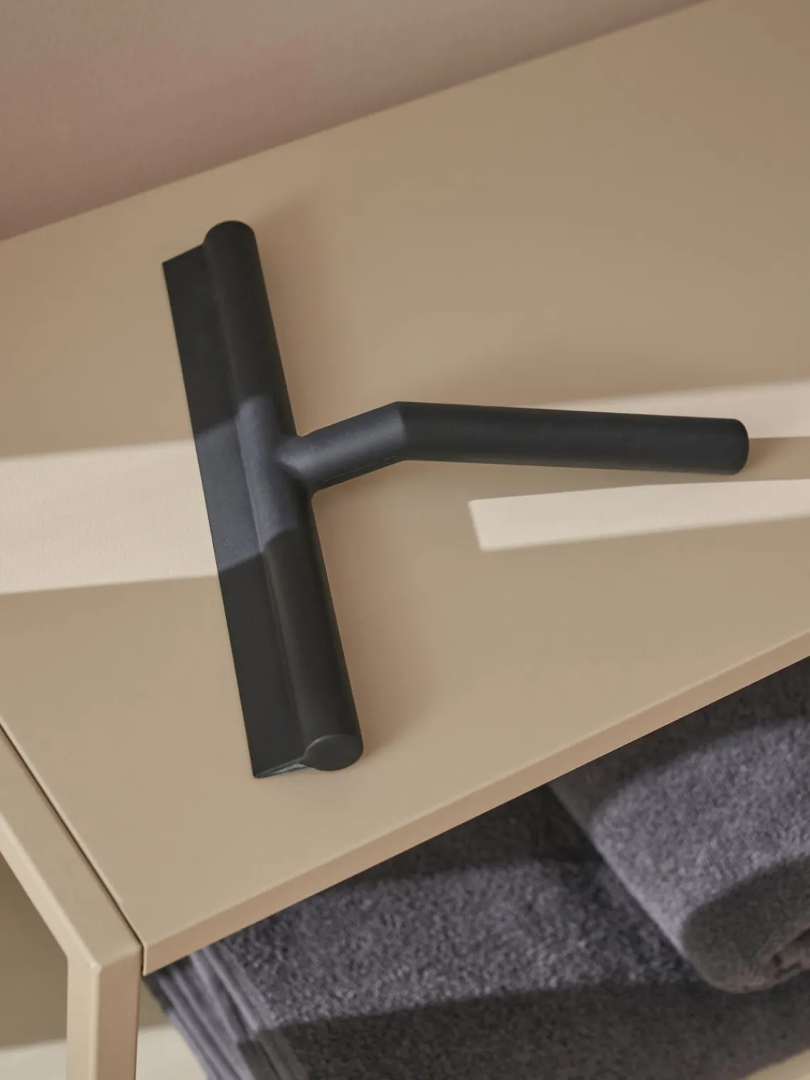 Gracias al soporte autoadhesivo, el limpiacristales de goma se puede colgar fácilmente de la mampara o en la puerta de la ducha y, por lo tanto, siempre está a mano.